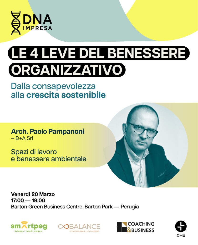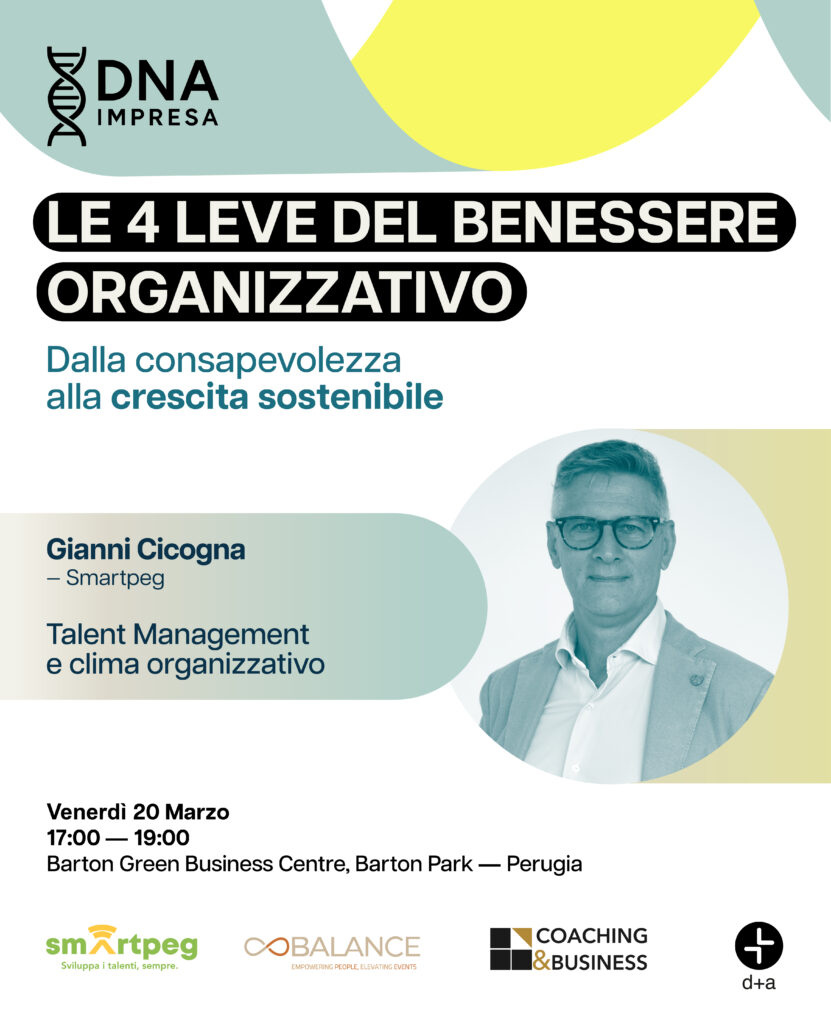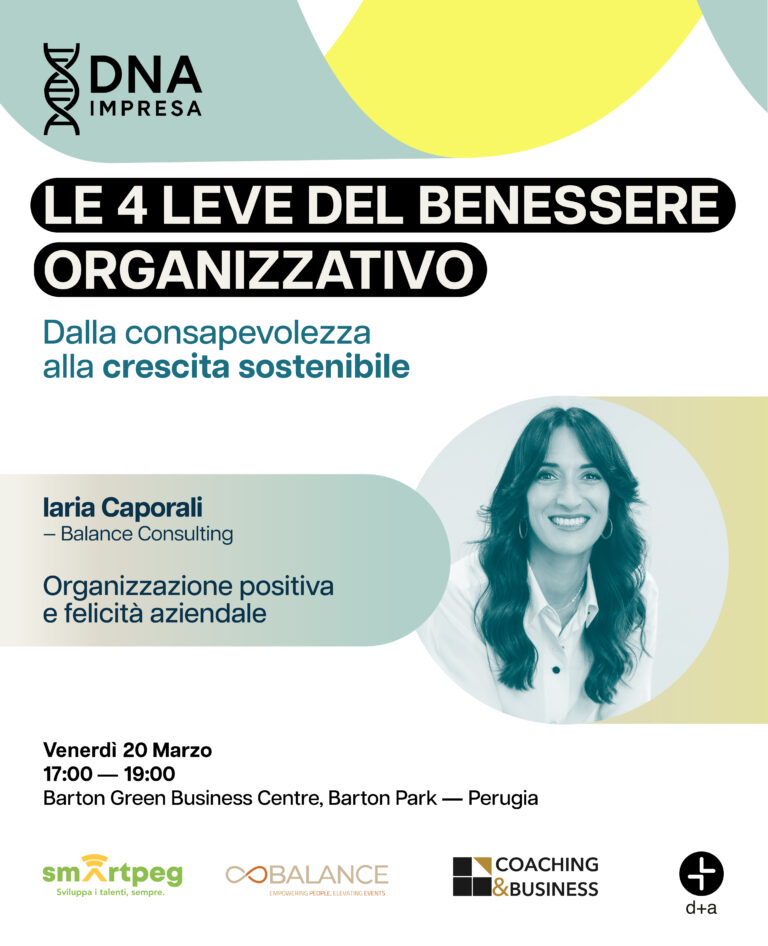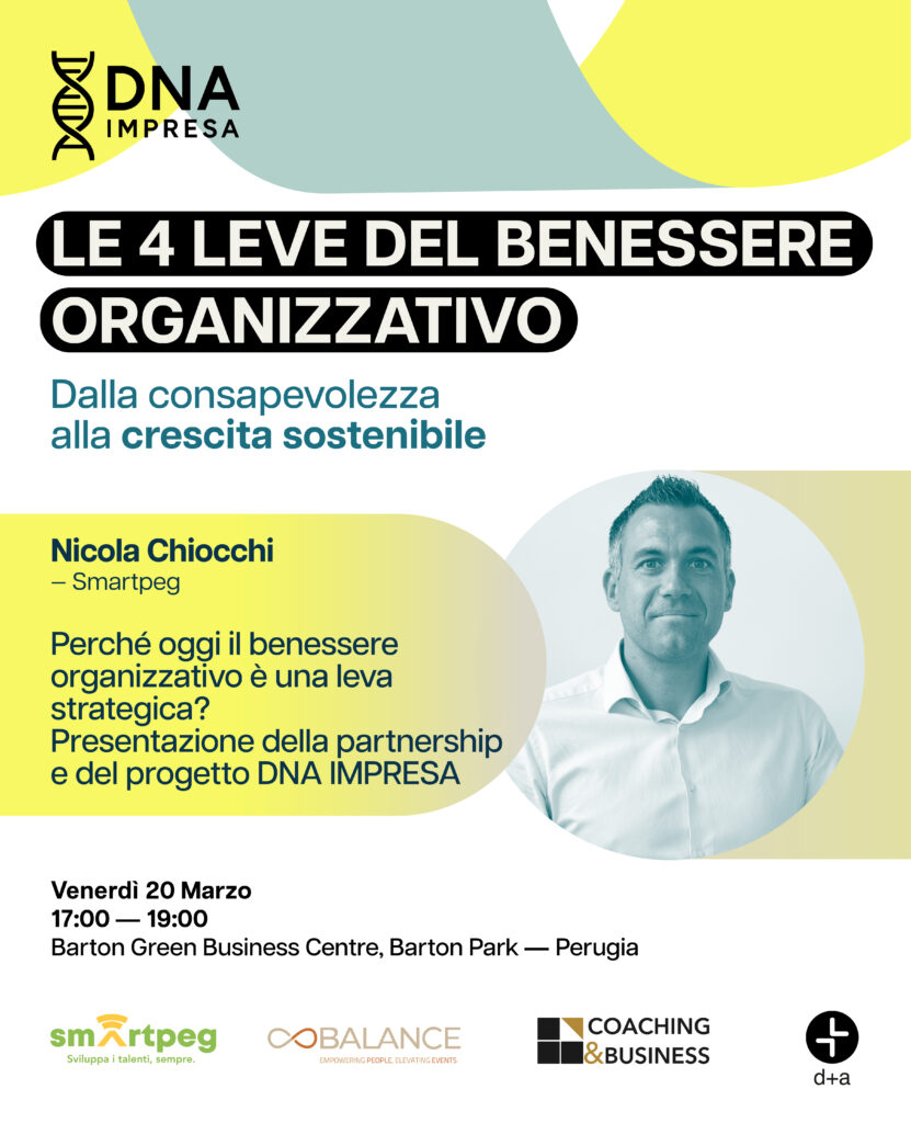 DNA Impresa – Le 4 leve del benessere organizzativo è un evento esclusivo dedicato a imprenditori e manager che vogliono comprendere come funziona davvero la propria organizzazione e su quali dimensioni intervenire per generare valore nel tempo.